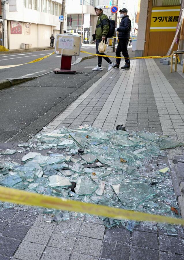 強い地震があった青森県八戸市で集められた割れたビルの窓ガラス。「頭上注意」と注意喚起されていた=9日午後0時21分