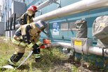 訓練では、消防車5台が現場に駆けつけ、署員が民家を囲むように放水した。延焼を防ぐため、カーテン状に放水する水幕ホースを2本つなぎ、建物の間に幅40メートル、高さ7メートルにわたって水の幕を作った。