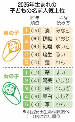 明治安田生命保険は14日までに、2025年に生まれた子どもの名前ランキングを発表した。男の子の1位は「湊」(みなと=主な読み方)、女の子は「翠」(すい)でいずれも初めての首位となった。明治安田生命は「人とのつながりや結びつきを連想させる名前が多い」と分析した。