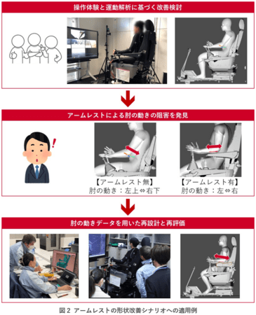 ・ 実際に建設機械の運転席に設置されるアームレストの改善シナリオに適用して、有効性を検証
