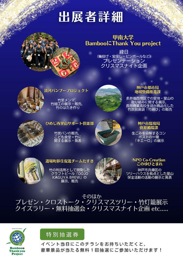 ・その他、プレゼン、クロストーク、クリスマスツリー、竹灯籠展示、クイズラリー、無料抽選会、クリスマスナイト企画 等