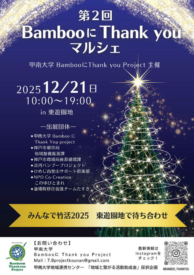 甲南大学(神戸市東灘区)は12月21日(日)に、東遊園地(神戸市中央区)で第2回「Bamboo にThank youマルシェ」を開催します。イベントを主催する「BambooにThank you Project」は、放置竹林問題の解決に取り組んでいる、学生を中心とした団体です。当日は、同団体による縁日の出し物企画やプレゼンテーション、クリスマスナイト企画のほか、神戸市都市局・同環境局やNPO法人などのさまざまな団体が参加し、竹の利活用や里山に関する取り組みについての展示、商品の販売などを行います。参加無料、事前申し込み不要。