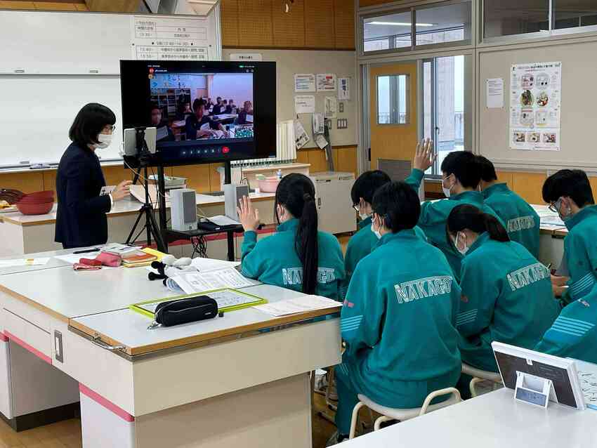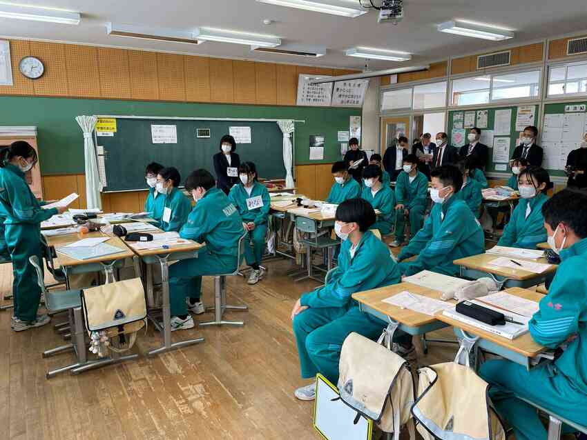 松井和子教諭、長瀬克也教諭による総合的な学習の時間「防災について考え、地域に貢献しよう」の授業が、第3学年で行われました。本時では、函館市立南茅部中学校生徒とオンラインで意見交流を行いました。中郷中学校と南茅部中学校では、それぞれ「高齢者と災害」をテーマに新聞作りを行ってきました。本時の前までに、お互いが作成した新聞を交換し、質問したり議論したりしたいことを考えて本時に臨みました。本時での意見交換を通して、記事に表れていない他地域の情報や思いに気付き、自分の地域の課題解決に生かそうとする意欲を高めることを目指した授業でした。「高齢者施設の入所者を避難させる際、誰がどのように避難させるのか」「高齢者施設から避難所までの距離」「具体的な避難方法はきまっているか」「移動手段はどのように考えられているか」など、質問が活発に飛び交い、新聞に表しきれなかった情報を獲得し合っていました。