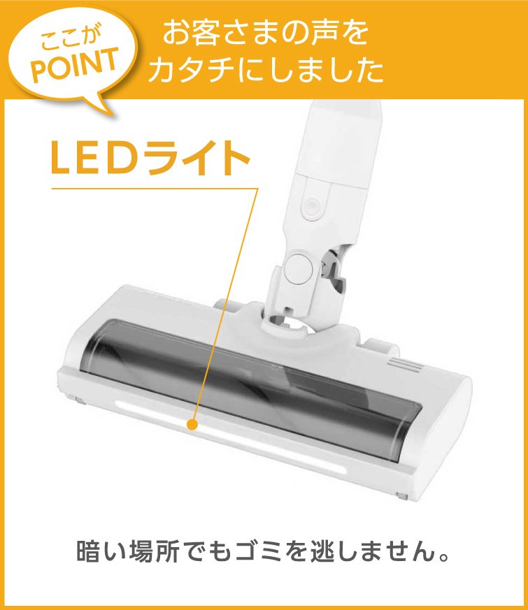 また、パワーブラシの先端にはLEDライトが搭載されており、家具の隙間やベッドの下などのゴミやほこりも見えやすくなり、取り残しを防ぎます。