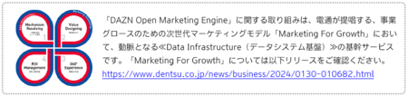 また、本ソリューションは、国内電通グループのデータクリーンルーム一元管理システム「TOBIRAS」※3と連携することで、高品質な分析ソリューションを迅速に提供し、クライアントの意思決定を強力にサポートします。今後は、分析によって広告効果が高いと想定される生活者へ直接アプローチする機能も追加する予定です。これにより、スポーツファンの分析、DAZN内での広告配信、効果検証までを人基点で一気通貫に実現します。