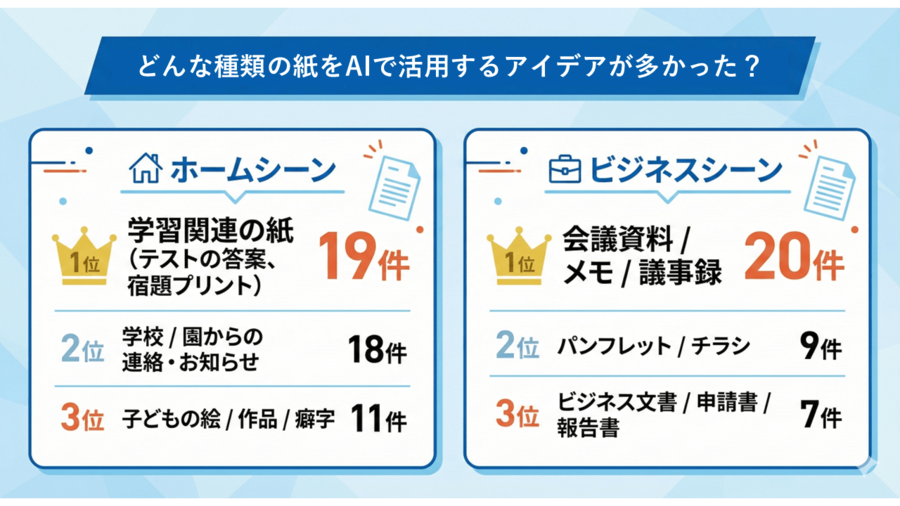 今回の応募では、子育て関連のアイデアが最も多く寄せられ、家庭領域における紙情報の活用が依然として進んでいない実態が明らかになりました。特にホームシーンでは、教育の最適化と家庭運営の効率化が中心テーマとなり、日常の管理負荷を軽減するアイデアが多数集まりました。