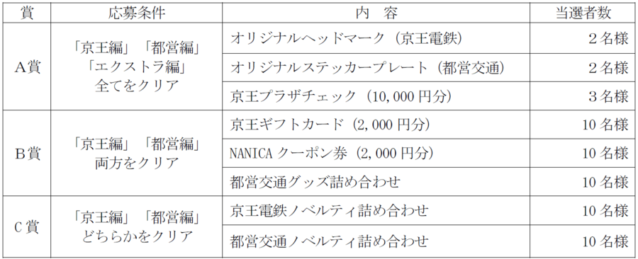・特設のイベントページにアクセスし、各章の「クリアキーワード」と必要事項を記入して応募すると、抽選で賞品が当たります。「京王編」または「都営編」の片方のみクリアされた場合でも応募は可能です。さらに両方をクリアすると応募できる商品の種類が増えます。加えて「エクストラ編」までクリアすれば、応募できる賞品の幅が広がりより多くのチャンスが得られます。