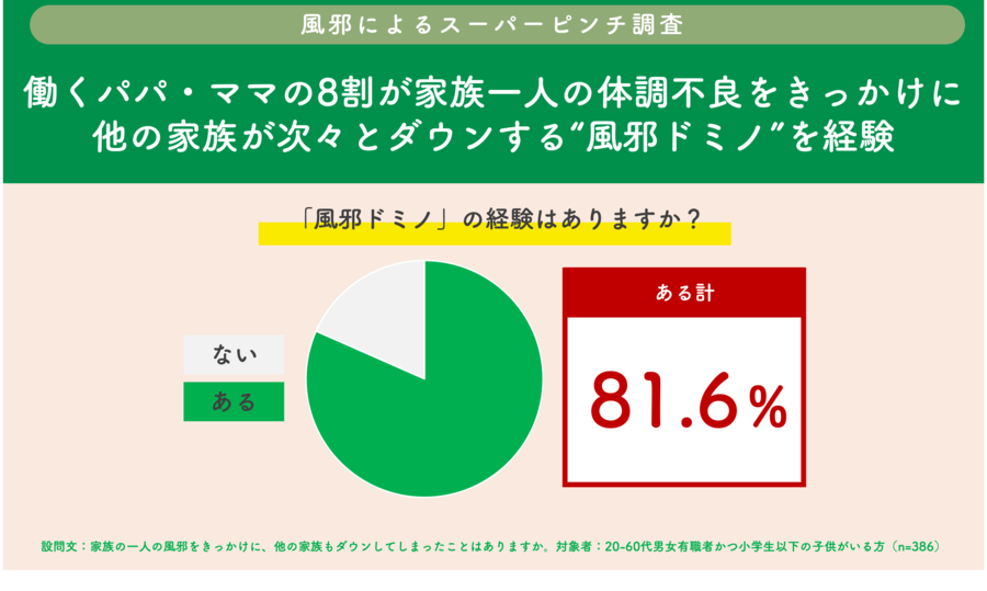 小学生以下のお子様を持つ20代から60代のビジネスパーソン(n=386)に「家族の一人の風邪をきっかけに、他の家族もダウンしてしまったことがあるか」を伺ったところ「ある」と回答したビジネスパーソンは81.6%に上り、多くの家庭が“風邪ドミノ”によるスーパーピンチを経験していることがわかりました。