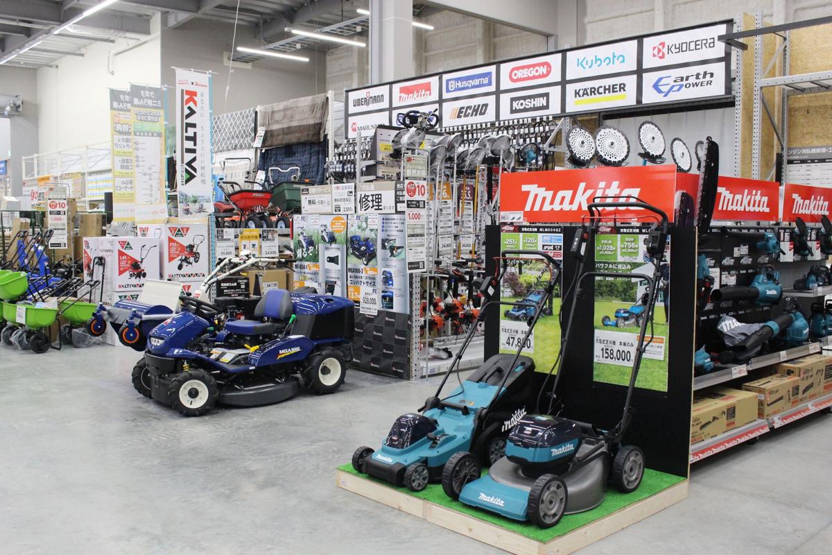 店舗は国道8号沿いで売り場面積は約1万平方メートル。前店で扱ってきた農業資材などのほか、品ぞろえを大幅に増やした。パワー初の試みとして、芝刈り機や耕運機など大型機器の専門コーナーを設置し、機器の修理も受け付ける。