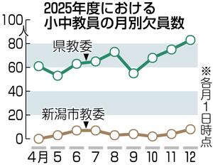 県教委によると、病気などによる休職や産休、育休で生じる欠員の内訳は、小学校が57人、中学校が26人。総計で4月は61人だったが5月には53人に改善。8月は73人に増えたが、長期休暇明けなどに欠員が減る傾向があり、9月は55人に減少。その後増加し83人となった=グラフ参照=。