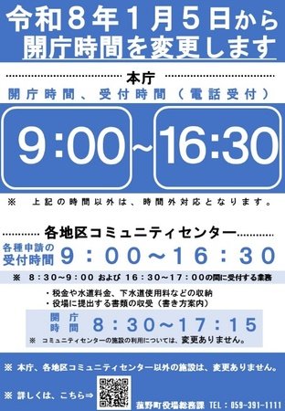 ※役場本庁および各地区コミュニティセンター以外の施設については、開庁・受付時間の変更はありません。