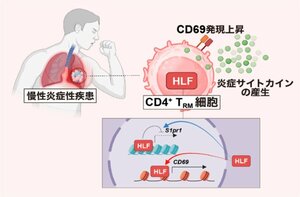 千葉大学大学院医学研究院 木内政宏助教と平原潔教授、横浜市立大学大学院医学研究科 呼吸器病学柳生洋行助教らの研究グループは、「組織常在性記憶CD4⁺T細胞(CD4⁺TRM細胞)」注1)が肺や腸などの組織に長期間とどまるメカニズムと、炎症性サイトカインの持続的な産生は、遺伝子の働きを調節するタンパク質である転写因子Hepatic Leukemia Factor(HLF)注2)によって制御されていることを新たに特定しました(図)。