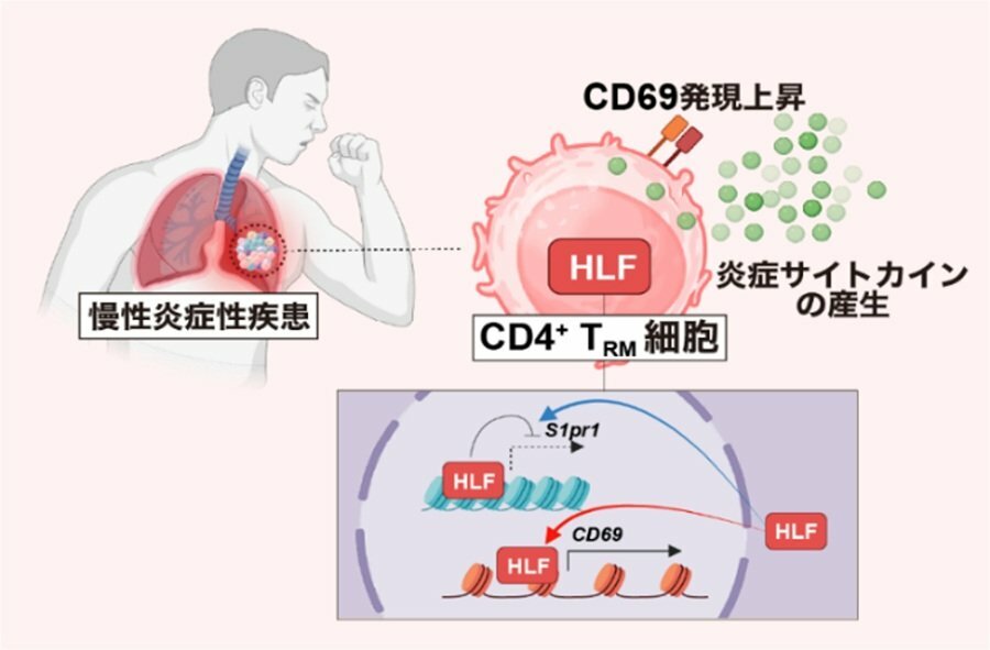 本研究では、転写因子HLFが、炎症反応を担う免疫細胞である炎症性CD4⁺TRM細胞を特定の組織に定着させる司令塔として機能することを初めて解明しました。