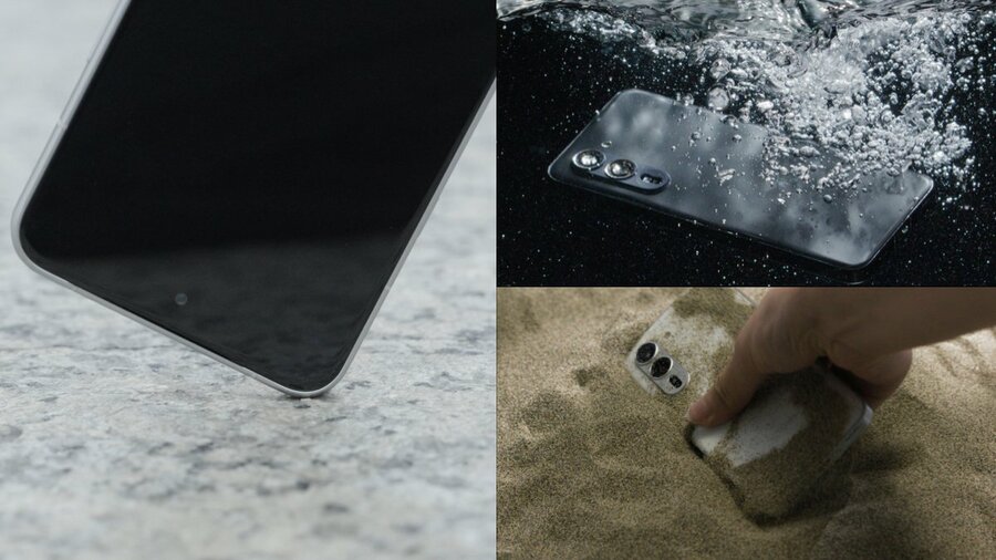 「arrows Alpha」は、資源循環を促進させるために、背面パネルなどに再生プラスチックを、メインケースの内部フレーム、カメラフレームには再生アルミニウムを採用しており、電気・電子部品を除く、部品総重量に対するリサイクル素材の割合は約60%となっています。また、独自技術による電池の長寿命化※6に対応しています。IP6Xの防塵性能及び、IPX6/8/9の最高水準の防水性能※7と、MIL規格※8の耐衝撃の要件を満たしており、1.5mの高さからコンクリートへ落下させても画面が割れにくい構造※9をもつ「arrows Alpha」は、世界最高水準の頑丈さ※10でディスプレイや本体を守り、製品の長期使用を可能としています。