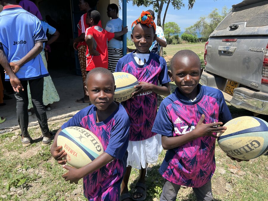 寄贈されたラグビーボールを持つキセギ村の子供たち