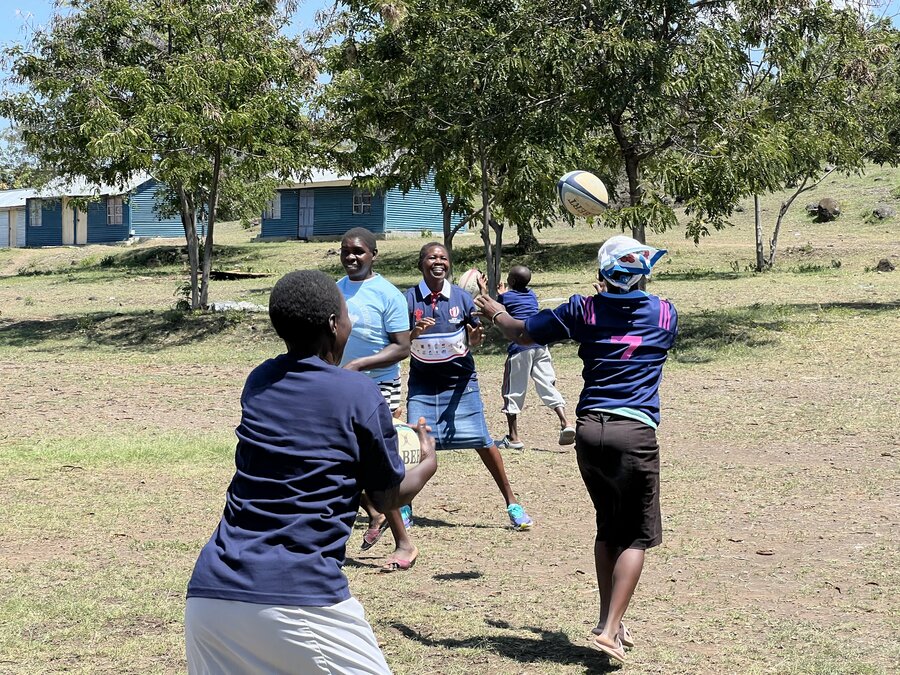 ラグビーボールを投げて楽しむキセギ村の子供たち
