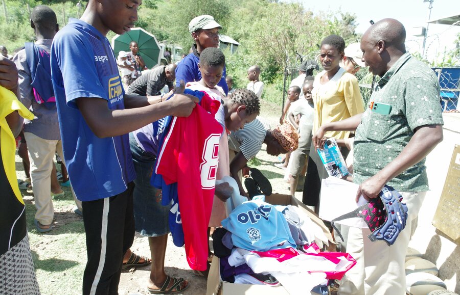 スポーツウェアを受け取るウテレレ村の人々