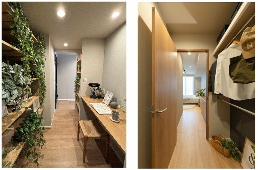 従来のウォークインクローゼットを、単なる収納ではなく“魅せる”収納や”使う“空間として活用できるよう、DENを設けることで、ライフスタイルに合わせて多彩に使える空間へとリノベーション。高さを自由に調整できる二段式のハンガーパイプは下段部分が着脱可能なため、飾るように魅せて楽しむ収納として使用できるほか、カウンタースペースは、使い方を限定しない余白スペースとして、好きなものを並べた作業スペースや趣味部屋など住まい手の想像力を膨らませ、“自分らしい暮らし”を実現できる空間となっています。