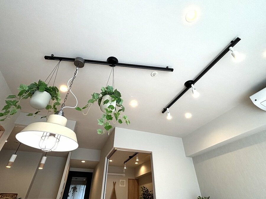 LDKや洋室2部屋には、照明器具を自由に付け替えられるダクトレールを設置しました。ペンダントライトやスポットライトなど、お好みの照明に簡単に変更できるほか、植物を吊るすハンギングプランターも取り付けられるため、自分らしいインテリアにアレンジができます。また、各居室の照明はシーリングでなくダウンライトを中心に採用することで、お気に入りの観葉植物や家具をやわらかく照らし、より愛着をもたらす居心地のよい空間を演出します。さらに、リビングや洋室の壁には下地補強を施しており、入居後に棚を取り付けるなどDIYでのカスタマイズも可能です。