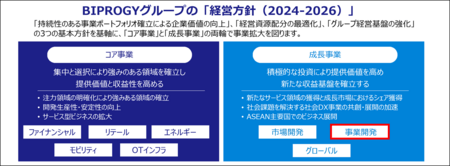 BIPROGYグループが経営方針(2024-2026)掲げる成長事業において、三つの重点戦略を定め、経営資源の集中により高い価値提供を目指します。本ニュースリリースの事業は、「事業開発」(スマートライフ分野)における取り組みと位置付けています。