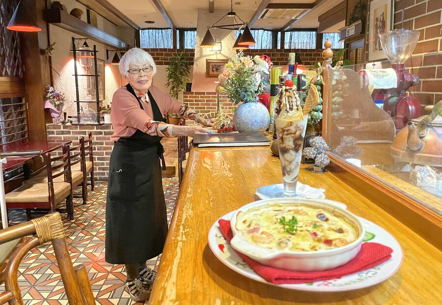 創業50年を節目に閉店。昭和レトロなたたずまい。グラタンとスパゲティを組み合わせた「スパグラ」が看板メニュー。チョコレートパフェ「チョコロック」も人気。火、金曜休み。
