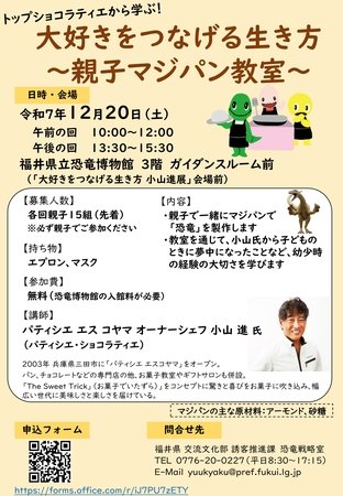 12月20日(土)には、小山氏によるワークショップ「大好きをつなげる生き方~親子マジパン教室」を開催します。親子でマジパンを使って「恐竜」を制作するほか、小山氏から子どものときに夢中になったことなど、幼少時の経験の大切さを学びます。教室は事前申し込み制で、すでに定員に達しています。