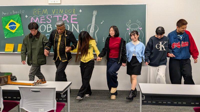 授業では、ギターを奏でながら、ブラジルの文化はポルトガル人・先住民・黒人・外国人移民の文化が融合して形成されていることや、ミゲル氏は先住民の先祖を持ち、近年は自然と一体の暮らしを継承してきた先住民の豊かな文化や多数の言語が失われつつあることの懸念をお話しされました。また、2025年は、ブラジルと日本の正式な国交が結ばれてから130周年という友好交流年であり、両国の架け橋となるブラジルの日系社会や在日ブラジル人を通じた両国の深い結びつきについても言及されました。