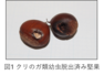 野外における重要な堅果の特徴の一つに、虫害(虫食い)が挙げられます。堅果はゾウムシやガの仲間の幼虫に食べられることがあり、その結果、林床にはさまざまな虫害堅果が多数混在します。野ネズミは、虫害堅果も識別し、健全堅果とは異なる反応を示す場合があります。しかし、そのような報告のほとんどはゾウムシ類による加害を対象にしており、ガ類については知見が不足しています。また、健全堅果と虫害堅果で、どちらがより多く持ち去られるのか?や、堅果の運命は異なるのか?といった点に着目した調査が多く、どのように堅果を識別し、選択しているのか?という過程は不明です。そこで本研究では、アカネズミ属のネズミ(アカネズミ、ヒメネズミ)を対象に、クリのガ類幼虫脱出済み堅果(ガの幼虫が食べて脱出した堅果)(図1)に対する反応を野外実験で確認しました。