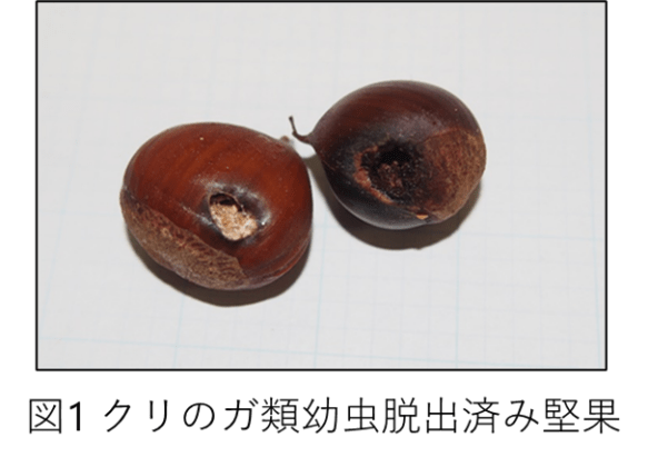 ・林床注1)上のクリ堅果(けんか)注2)の多くは、ガの幼虫に摂食されていた。