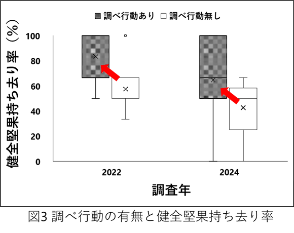 次に、2022年と2024年の9月~10月にかけて、健全堅果とガ類幼虫脱出済み堅果を同時に林床に供試し、カメラで野ネズミによる堅果持ち去り行動を一晩撮影しました。その結果、野ネズミはガ類幼虫脱出済み堅果よりも健全堅果を先に持ち去りました(図2)。また、約半数の野ネズミが、持ち去る前に、においを嗅いで堅果を調べる行動(調べ行動)を示しました。その後、周囲の堅果に対する調べ行動に移り、野ネズミが堅果を持ち去る前に堅果の状態を比較していたことが示唆されました。さらに、調べ行動を示した時の方が、健全堅果を持ち去る割合が高まりました(図3)。一方で、調べ行動をすると、堅果を持ち去るまでに数秒余分に時間を要しました。