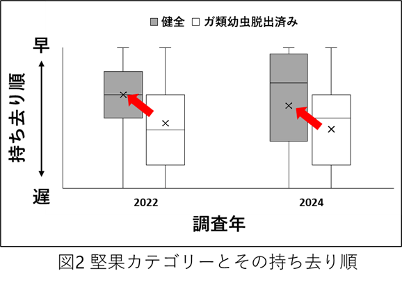 まず、落下したクリ堅果の内部状態を調べると、ガの幼虫が食べて脱出した堅果(ガ類幼虫脱出済み堅果)が多く存在していました。したがって、この虫害堅果と、野ネズミは高い確率で遭遇していると考えられます。次に、この虫害堅果を健全堅果と同時に林床に置いたところ、野ネズミは健全堅果を先に持ち去りました。また、画像解析によって、においを嗅いで素早く堅果を比較し、調べていたことが確認されました。さらに、堅果を調べた方が、健全堅果を持ち去る割合が高まることも見出されました。