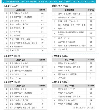 ・2025年で心に残ったできごと(5つまで)を自由回答で挙げてもらい、その中で最も心に残ったできごとを聞いたところ、小中学生は「家族や親せきとの旅行」が最多。続いて「学校の修学旅行・課外授業」で、ほとんどが「修学旅行」ですが、「遠足」「職業体験」「自然教室」という回答もありました。