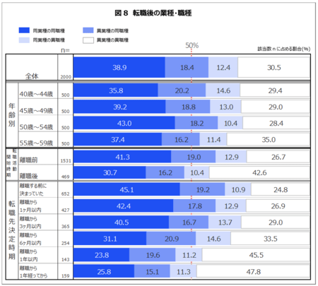 転職後の業種・職種は、転職前と「同業種の同職種」が最も多い(38.9%)が、次いで「異業種の異職種」が多く(30.5%)、とりわけ50代後半については「異業種の異職種」に就いている割合が高い(35.0%)。