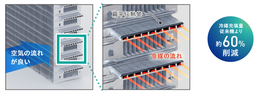 細径化した冷媒流路を多数設け、冷媒の熱を効率よく空気に伝達するオールアルミ製の「マイクロチャネル熱交換器」を採用したことで、省エネ性が向上しました。また、冷媒充填量も従来機より約60%※7削減しています。