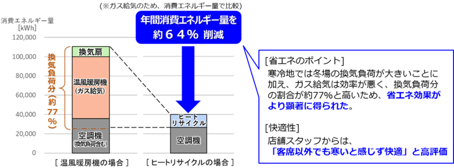 暖房負荷の高い寒冷地での熱回収効果の検証として、北海道の飲食店の新築店舗に『ヒートリサイクルシステム』を導入し、実証試験を行いました。『ヒートリサイクルシステム』で1年間営業した実測運転データと、北海道の別店舗 で従来導入している「ガス給気の温風暖房機」※6の場合での試算値との比較にて、年間消費エネルギー量の約64%もの削減を達成しました。寒冷地では冬場の換気負荷が大きいことに加え、ガス給気は効率が悪いため 、省エネ効果がより顕著に得られる結果となりました。