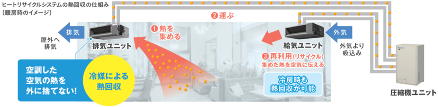本システムは、換気時に排出する熱を冷媒で回収し、ヒートポンプ技術を活用して再利用する新たな換気システムです。コロナ禍を経て換気の重要性が再認識される中、空調負荷の約4割※1が換気によるものであることから、換気と省エネの両立が求められています。『ヒートリサイクルシステム』は、換気の際、通常であれば屋外に排出されてしまう熱を冷媒で回収し、室内に取り入れる外気の温度調節に再利用することで、換気による空調負荷を低減し、部屋全体を効率的に空調することができます。実店舗での実証試験では、従来の空調・換気システムに比べて年間の消費エネルギー量を約64%※2削減しました。