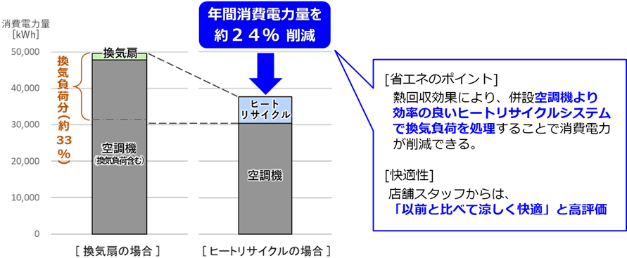 実使用環境下における熱回収効果の検証として、東京都の小売店に『ヒートリサイクルシステム』を導入し、実証試験を行いました。『ヒートリサイクルシステム』で1年間営業した実測データと、更新前の同店舗の「換気扇方式」での試算値との比較において、年間消費電力量の約24%※5の削減を達成しました。