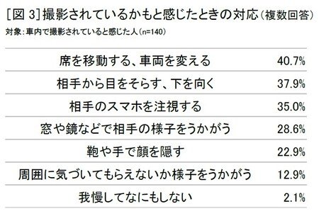 車内で「撮られているかもしれない」と感じたことのある140人にその際の対応について聞くと、「席を移動する、車両を変える」(40.7%)、「相手から目をそらす、下を向く」(37.9%)、「相手のスマホを注視する」(35.0%)、「窓や鏡などで相手の様子をうかがう」(28.6%)、「鞄や手で顔を隠す」(22.9%)などの対応がとられていることが分かりました[図3]。