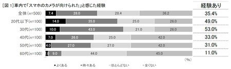 その結果、車内で「他人のスマホのカメラが自分に向けられているかもしれない」と感じた経験がある人は、全体の35.4%でした。また、20代以下は49.0%、30代は53.0%と約半数が「経験がある」と回答し、若い世代ほど他人のスマホのカメラレンズの向きに対する意識が高いことが分かりました[図1]。