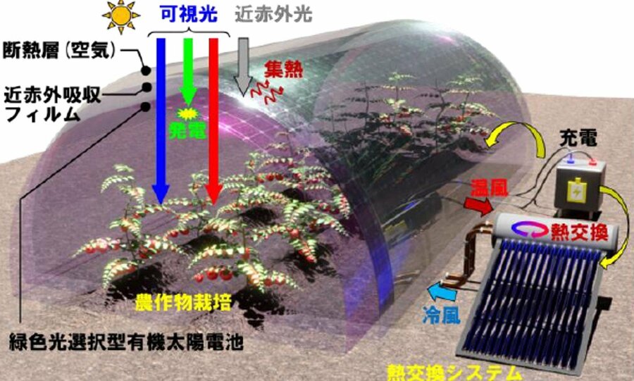 光透過性と発電の両立:植物に必要な光を通しながら緑色光で発電し、ハウス内の温度上昇抑制にも寄与