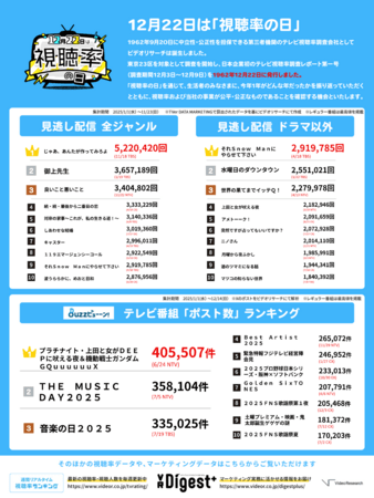 株式会社ビデオリサーチ(本社:東京都千代田区、代表取締役社長執行役員:石川 豊)は、日本企業初の視聴率レポート第一号を発行した12月22日の「視聴率の日」にあたり、テレビ視聴率調査結果や見逃し配信の再生回数ランキングなどから、2025年によく見られたテレビ番組をまとめましたのでお知らせします。