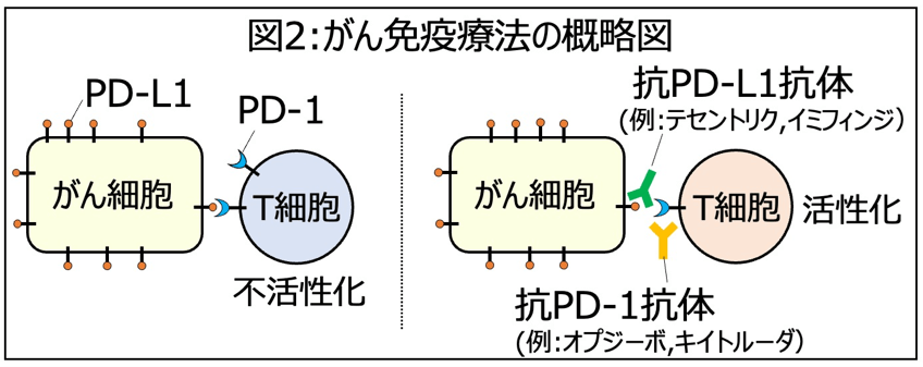 がん細胞は活性化したエフェクターT細胞によって排除されますが、がん細胞膜表面上のPD-L1が、T細胞の膜表面上に発現するPD-1へ結合することによって、T細胞の活性を抑制することが知られています(図2左)。がん免疫チェックポイント阻害薬では、PD-L1もしくはPD-1に対する抗体により、その反応系を阻害することで、T細胞によるがん細胞の排除を促進させています(図2右)。