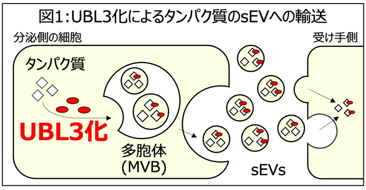 エクソソームを代表とするsEVは、がん細胞、間葉系幹細胞など様々な細胞種から分泌されるナノメートルサイズの小胞体です。研究グループはこれまでにUBL3による新たな翻訳後修飾注3機構を発見し、UBL3化を受けたタンパク質がsEVへ輸送されることを見出していました(図1, Ageta et al., Nat Commun 2018, Cell Mol Life Sci 2019)。