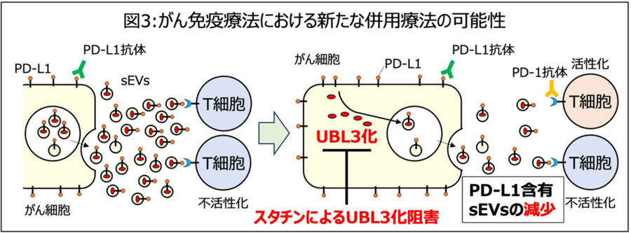 研究グループは、PD-L1が「UBL3化修飾」という新しい仕組みによりsEVへ運ばれること、そして高脂血症治療薬スタチンがその過程を抑えることを見出しました。