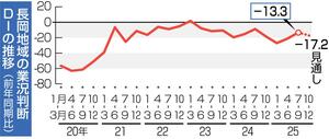 長岡市と長岡商工会議所が市内事業所を対象に行った2025年7〜9月期の景況調査では、業況判断指数(DI)はマイナス13・3となり、前期(4〜6月期)と比べ7・9ポイント改善した。改善は2四半期連続=グラフ参照=。商業、建設業の改善が寄与した。雇用状況は20期連続で「不足」が「余剰」を上回り、人手不足感が高まっている。