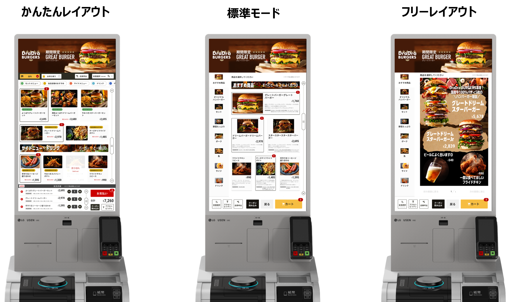 より短時間での注文を重視した「かんたんレイアウト」、客単価向上を重視した「標準モード」、店舗デザインを自由に反映できる「フリーレイアウト」の3つのデザインモードを搭載。店舗運営の方針や業態に合わせて、柔軟にカスタマイズ可能。