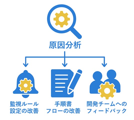 発生した事象については必ず原因分析を行い、「なぜ起きたのか」「どうすれば防げたのか」を振り返ります。その結果をもとに、監視ルールの追加・閾値の見直し、対応手順書の更新、開発チームへのフィードバックなど、再発防止に向けた改善を継続的に実施しています。