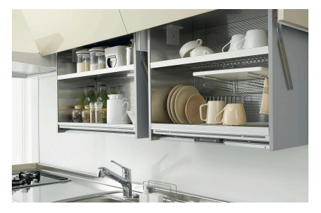 スイッチ一つで目の前の高さまで降りてくる吊戸棚収納。踏み台を使ったり、背伸びをしたりする必要がなく、身体に負担をかけずに安全に物の出し入れができます。