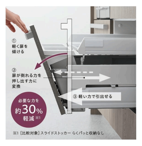 調理する人の動線に沿って道具が取り出せる、らくパッと収納。扉が斜めに傾く動きを利用して、引出しを開けるために必要な力を約30%※軽減しました。軽い力で開閉でき、腰をかがめたり、奥のものを探したりする負担を軽減します。