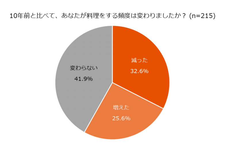 50代以上の方に、10年前と比較した調理頻度の変化を尋ねたところ、「変わらない」(41.9%)が最も多かったものの、「減った」(32.6%)、「増えた」(25.6%)と回答した人も多く、調理頻度に見直しがなされている様子がうかがえました。
